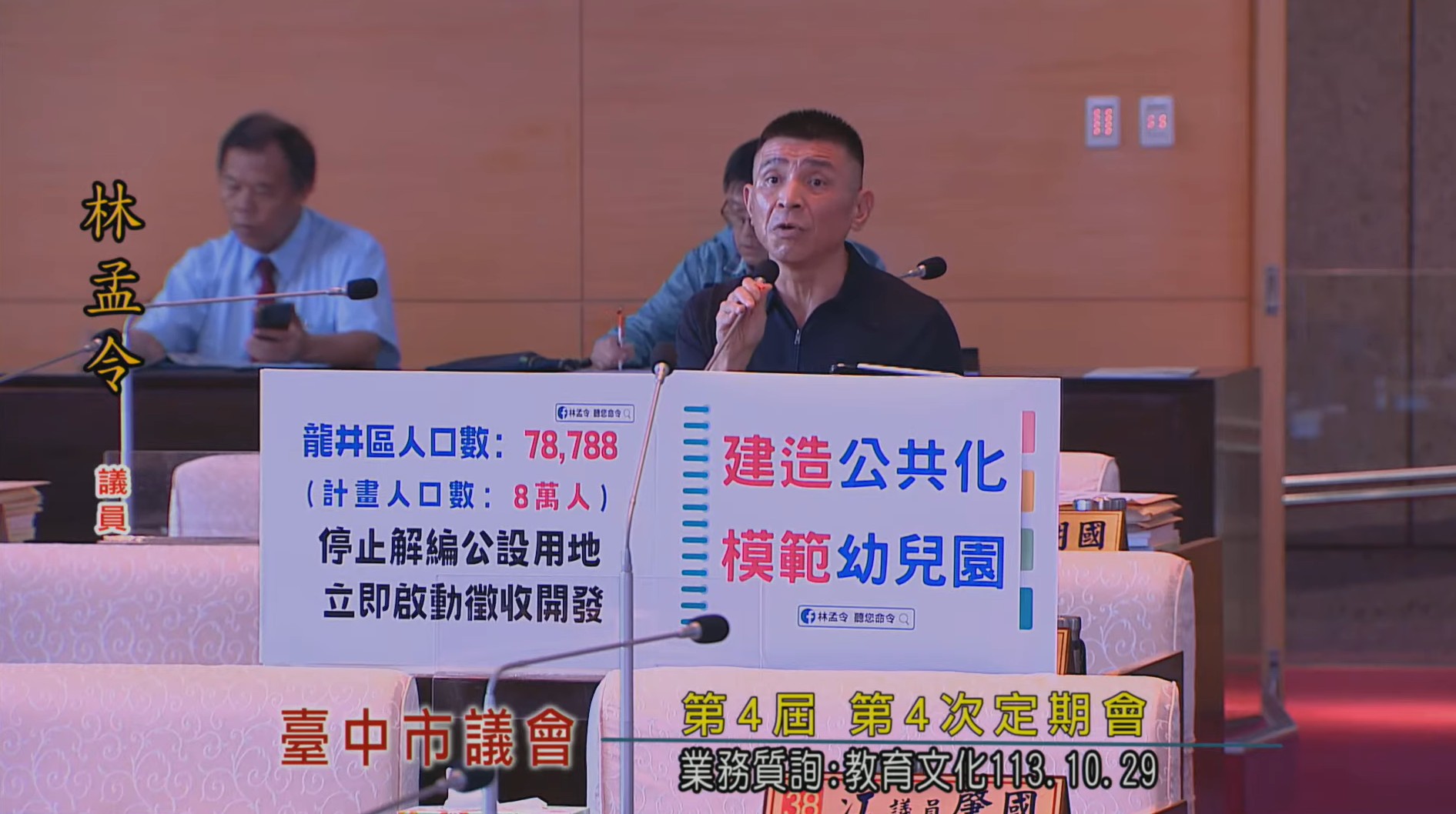 林孟令質疑,台中市擁有豐富的教育資源,卻未能有效運用,導致公幼、附幼吸引力不足,家長傾向選擇私立幼兒園。對此,他詢問教育局對此現象的看法及改善計劃。教育局長表示,公立幼兒園的招生受到少子化影響,以及部分地區接送不便等因素限制;此外,私立幼兒園在教學內容方面較為多元,可能更符合家長需求。