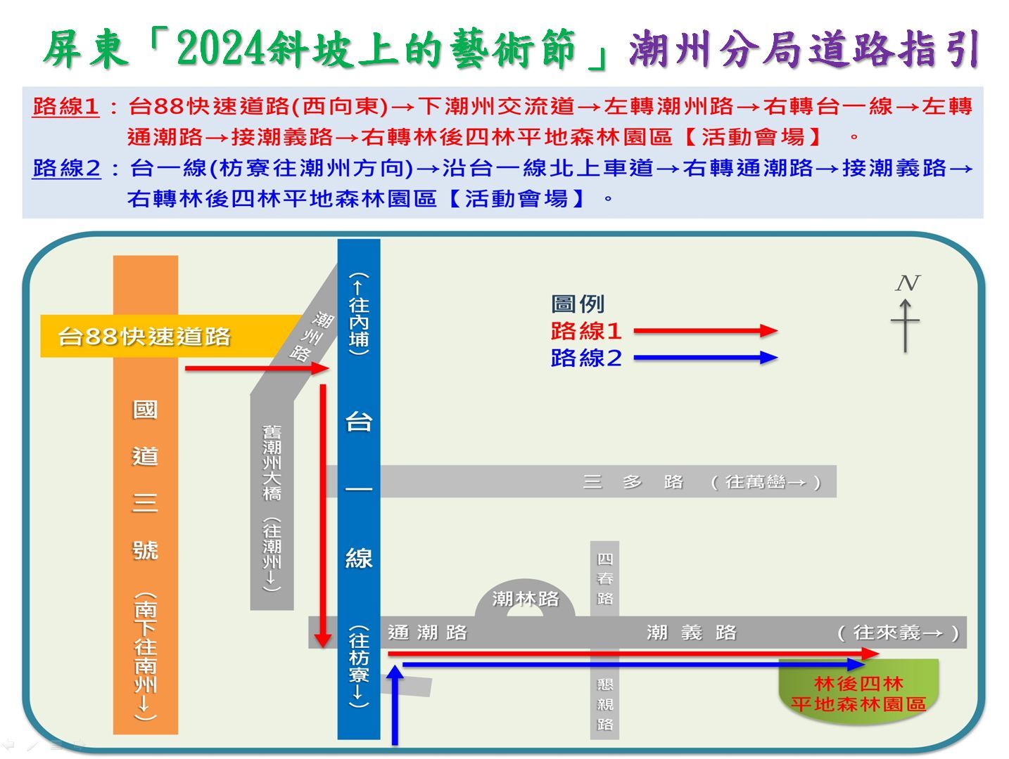 屏東縣政府將於11月30日及12月1日(共2日)每日12時至22時在潮州鎮林後四林平地森林園區辦理「2024斜坡上的藝術節」,潮州分局特別針對園區周邊道路規劃交通疏導勤務,以維行車順暢,並將設攤宣導反詐騙、反毒及婦幼安全等各項警政活動,以下提供行車導引及停車資訊供民眾參考。