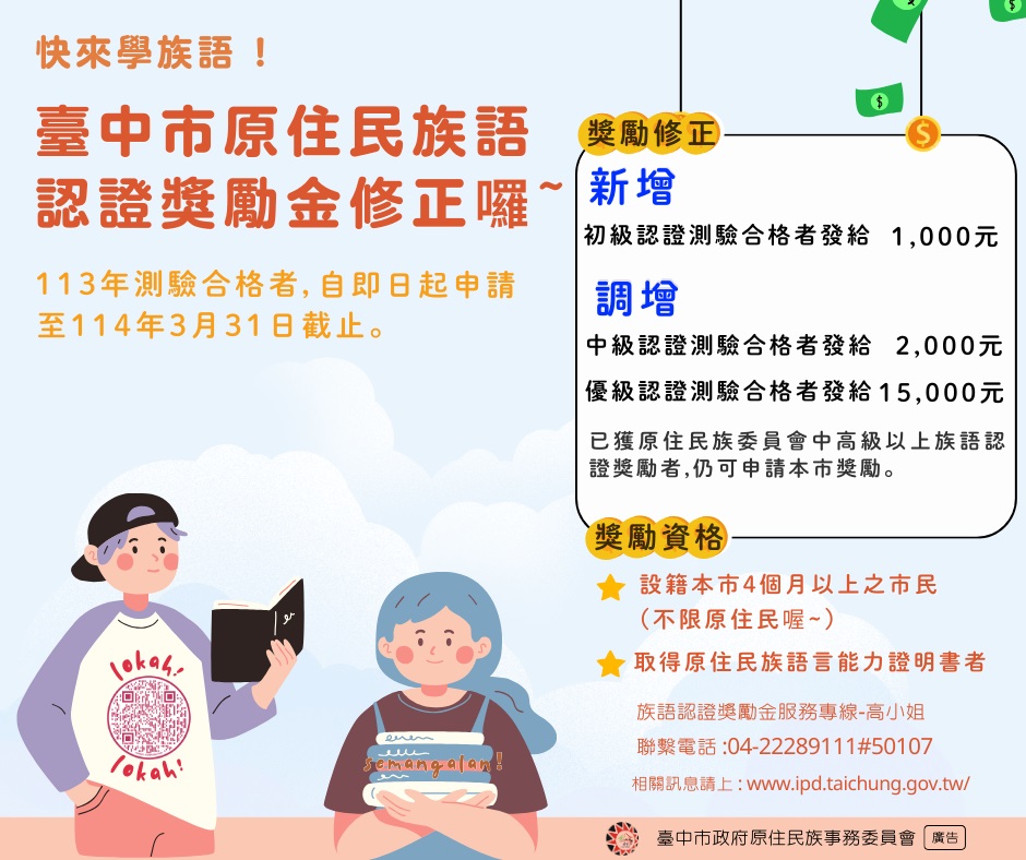 為推動原住民族語言的保存與傳承,並鼓勵全體市民一同學習原住民族語,台中市政府修訂《原住民族語能力認證測驗獎勵要點》,新增初級測驗合格者發給1,000元獎勵金,並調增中級及優級獎勵金。市府原民會表示,原住民族語是國家重點保護及發展的語言之一,期望透過獎勵將其發揚與推廣,台中市除了原住民可以申請外,不具原民身分的一般市民,如果也學習原住民族語,而且參加認證測驗合格後,也可以申請獎勵,落實全民化原住民族教育。