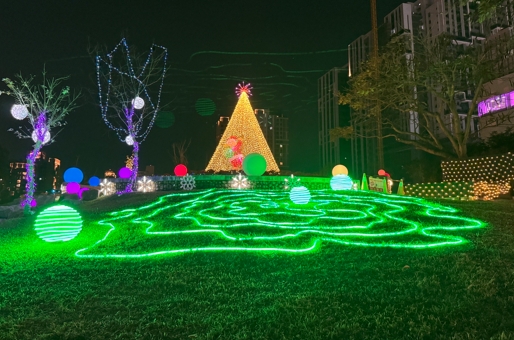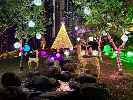 陳局長說明,此次湧泉公園的燈飾設計以活潑趣味為主題,描繪聖誕老公公在燦爛的五彩球間展開一場奇幻冒險,尋找回家的路。園內的五顏六色球形燈飾與暖白色聖誕樹交相輝映,樹上的小彩燈與象徵河流的藍白燈光巧妙融合,增添冒險故事的夢幻氛圍;透過這個設計,聖誕老公公將引領市民朋友穿越五彩繽紛的秘境,留下充滿奇趣與溫馨的佳節回憶,為今年的聖誕季增添無限美好。