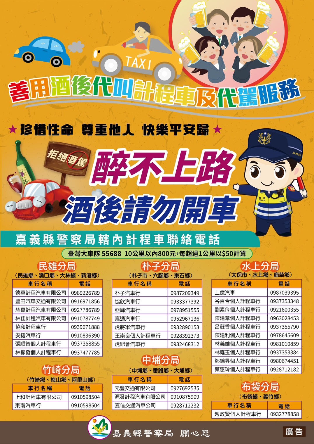 自即日起至明(114)年3月,嘉義縣警察局將持續規劃高強度「酒駕執法」專案,擇定轄內飲酒場所周邊外圍路段及易發生酒駕肇事路段加強酒測攔檢,呼籲民眾參加新春尾牙及各種飲宴活動,應事先指定駕駛,利用大衆運輸、計程車代步,或善用代駕服務,千萬不可酒醉上路;另提供酒類餐飲業者,亦應善盡勸導消費者勿酒駕之社會責任,警方將落實溯源究責。