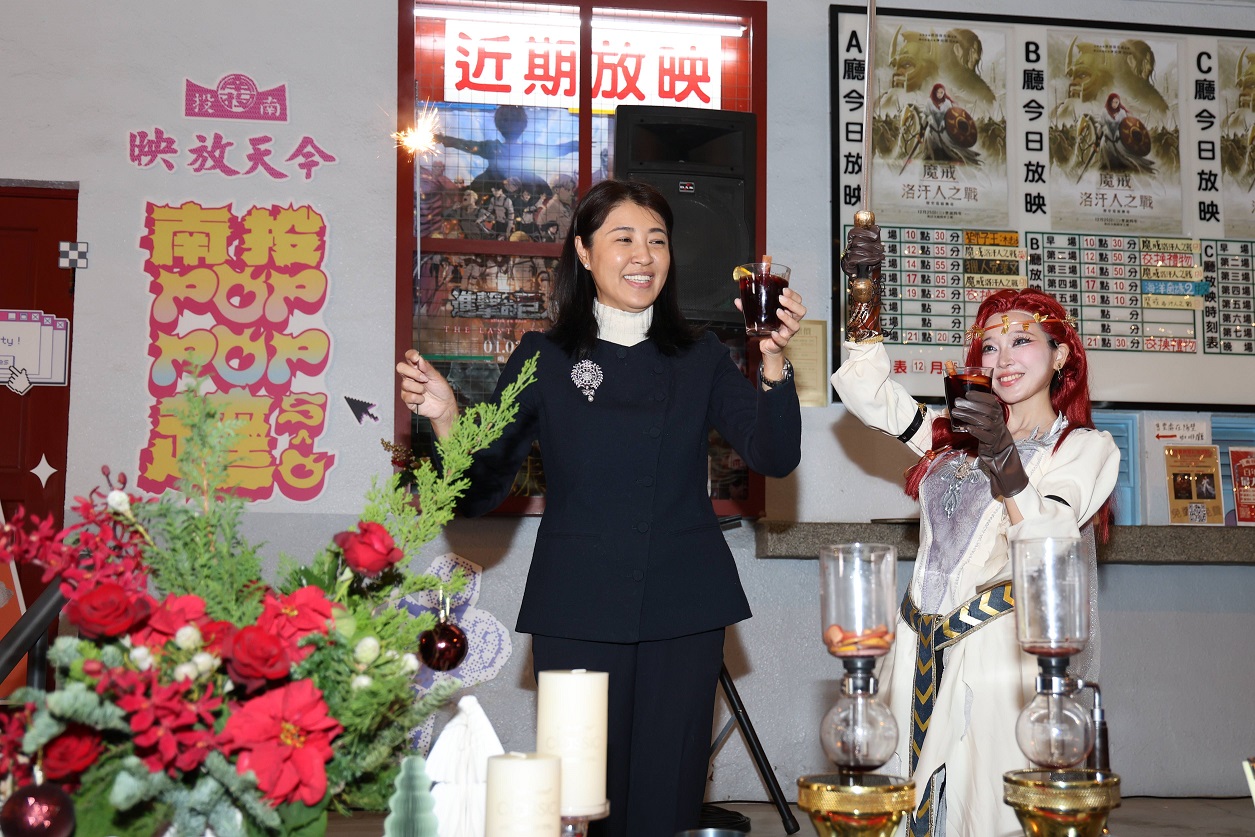 聖誕節瘋派對!百年南投戲院精心策劃一場Y2K千禧復古風聖誕趴,縣長許淑華與變裝成「魔戒」電影赫拉公主的知名Coser(角色扮演者)楊哲,一起將盤踞在戲院前簷上的大型「POP POP蛇」,以及宛如薑餅屋的戲院建築上滿佈的聖誕燈飾點亮「瞬間放閃」!令滿場參加的民眾驚豔,也為活動掀起高潮。