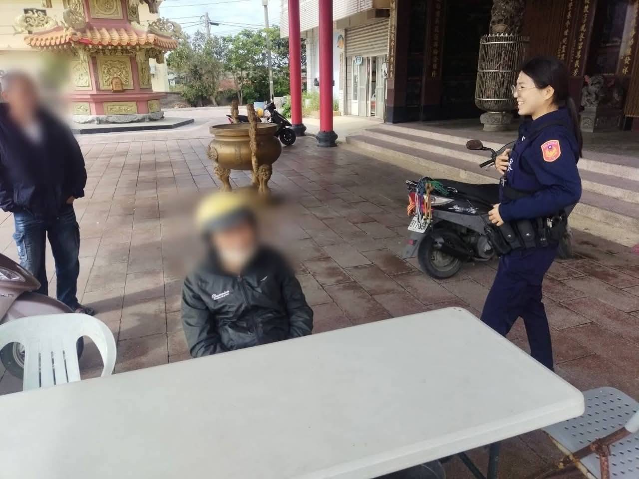 當時氣溫僅15度,且因靠近海邊風速強勁,他一人獨坐廟前相當危險,員警請他坐上警車閒話家常,閒聊中發現鍾姓老翁疑似神智略為恍惚,不能自述身分及居住地,研判應是生病了,經以家常方式探詢並暖言安撫,終使渠卸下心防,告知姓名供警察查詢。來到所內,員警趕緊提供熱開水,以免老翁受寒,並查詢相關資料,發現渠孫女已於在警察登記緊急協尋失蹤人口,警方立即通知家屬前來接回,家人接獲員警電話相當開心,旋即趕赴至警所,並說:「爺爺因年紀大了,有中度失智情形,離家外出後不知所蹤,現在終於找到了,可以放心了。」家屬看到老翁安然無恙的在警所內,對於警方本於同理心積極協助表達萬分感激之意,並放下心中的擔憂與不安。