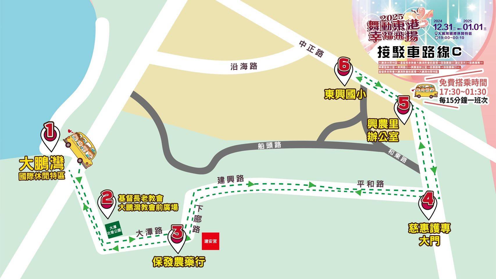 3、路線C:大鵬灣休閒特區→基督教長老教會大鵬灣教會前廣場→保發農藥行(建安宮外)→慈惠護專大門→興農里辦公處→東興國小→興農里辦公處→慈惠護專大門→保發農藥行→基督教長老教會大鵬灣教會前廣場→大鵬灣休閒特區。