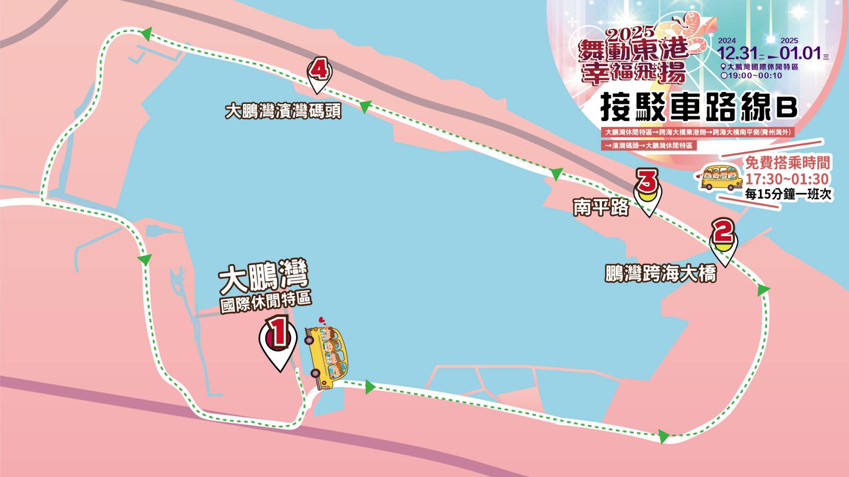 接駁專車行駛路線規劃如下(31日17時30分起至01日01時30分止,約15分鐘一班次):
