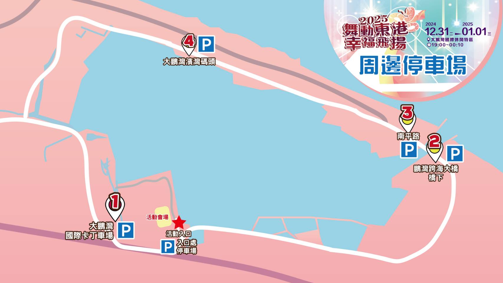大鵬灣國際卡丁車停車場、跨海大橋東港側、跨海大橋南平側(青州灣外、濱灣碼頭停車場及活動會場入口處備有接駁專車)。