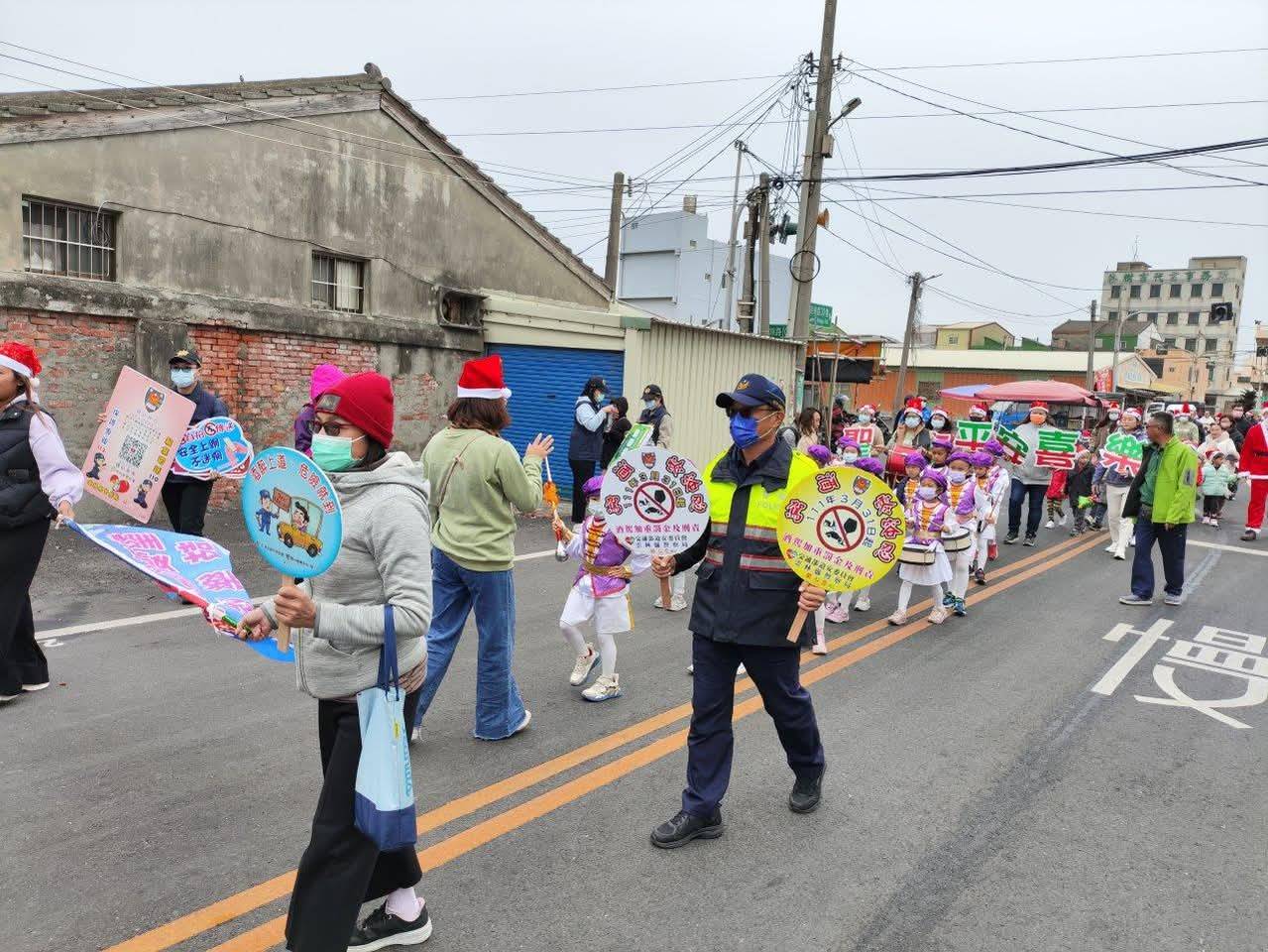【記者鄭忠嘉雲林報導】雲林縣警察局臺西分局日前攜手雲林縣聖愛幼兒園舉辦「聖誕踩街報佳音」活動,義警們手拉「不超速、不逼車」交通安全宣導布條配合幼兒園管樂隊打頭陣,為活動揭開序幕,員警們手持標語賣力向踩街沿線居民進行交通安全、婦幼安全及識詐宣導,並派員協助交通疏導,確保幼童安全及交通順暢。