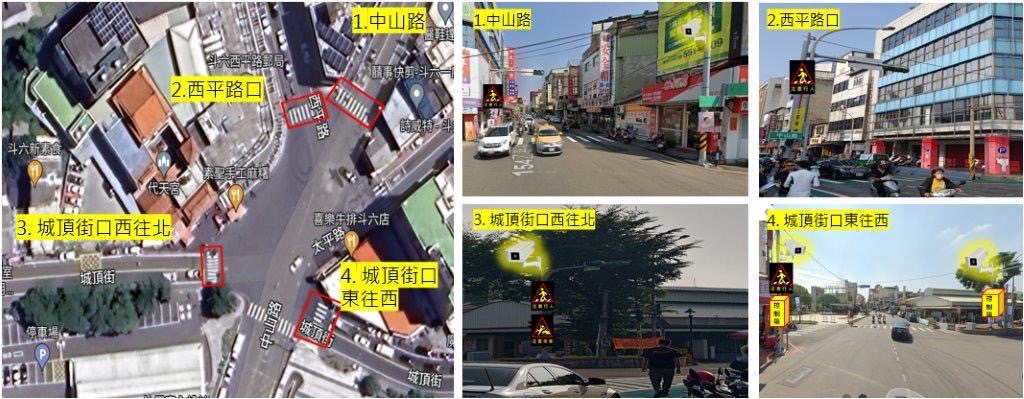 另外,為打造人本、永續、智慧的交通安全環境,於斗六市中山路與城頂街口導入智慧路口安全警示系統,建置攝影機4套、行人警示資訊面板4套、行車警示資訊面板1套,利用先進科技設備提前警示路口危險,透過行人警示資訊面板或行車警示資訊面板,提供相關告警資訊,提醒行人遵循號誌燈號、即時警示來車資訊,以建構行人安心通行環境及強化路口整體交通安全,希冀降低行人事故發生。