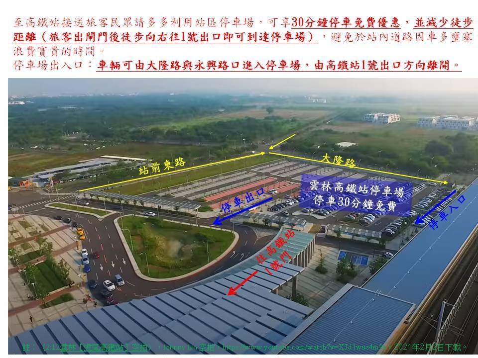 二、 高鐵雲林站於本次連假期間將於114年1月24日(星期五,假期前一天)16-22時及1月25日至2月2日每日8-22時實施改道措施,請接送旅客民眾屆時配合管制引導並預控時間,另請多多善加利用該站合作之停車場(入口於大隆路與永興路口,高鐵站1號出口方向),除享有30分鐘免費之優惠外,亦減少旅客徒步距離(旅客出閘門後徒步向右往1號出口即可到達停車場),亦能避免於站內道路因車多壅塞浪費寶貴的時間。