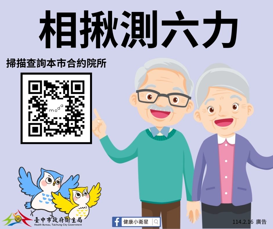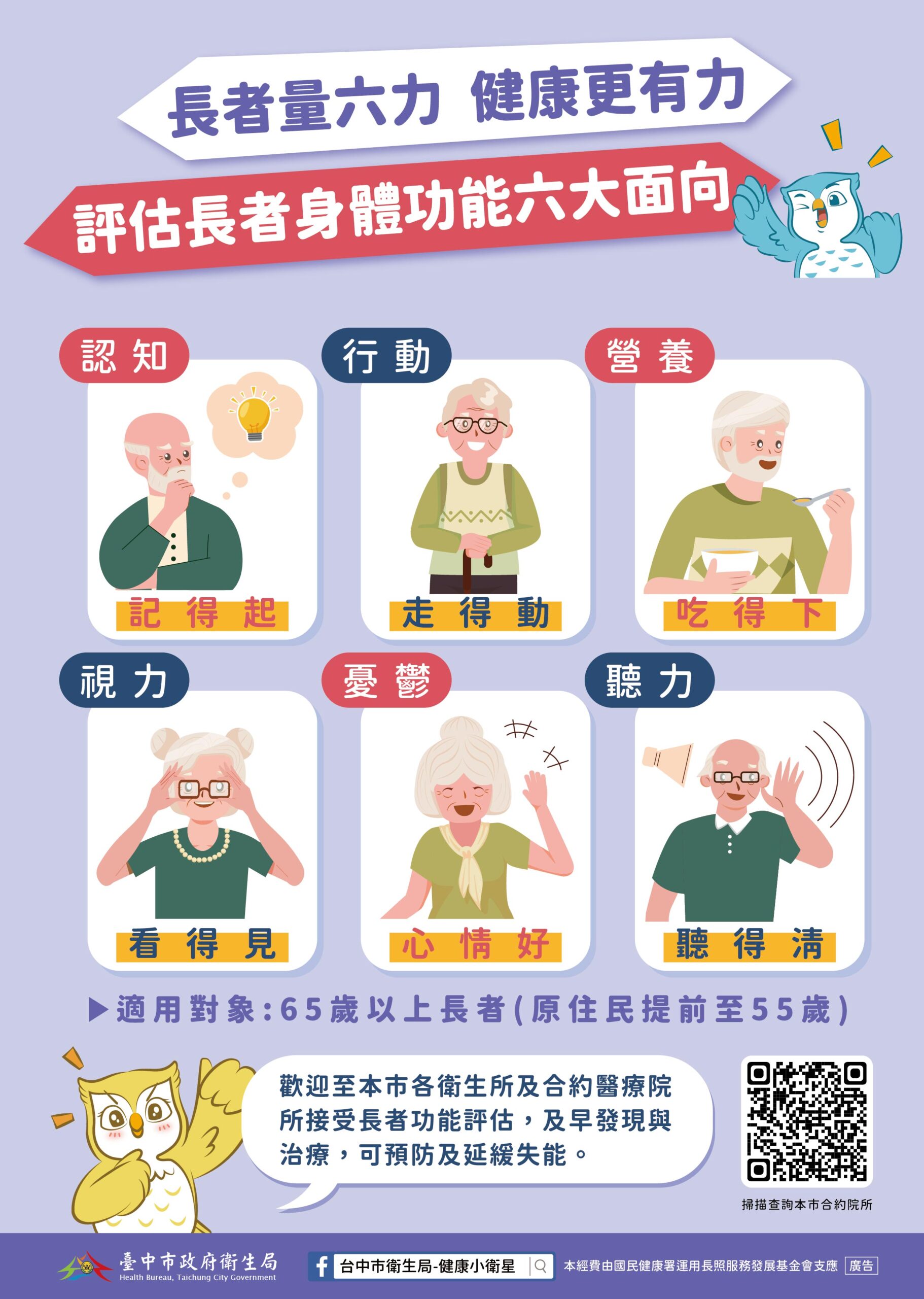 衛生局補充,有關台中市執行預防及延緩失能的長者功能評估合作醫療(事)機構,民眾可以透過衛生局網站(https://gov.tw/81p)進行查詢,更多健康訊息,歡迎追蹤台中市政府衛生局官方臉書專頁「台中市衛生局-健康小衛星」 (https://www.facebook.com/HealthTaichung/)獲取最新資訊喔!