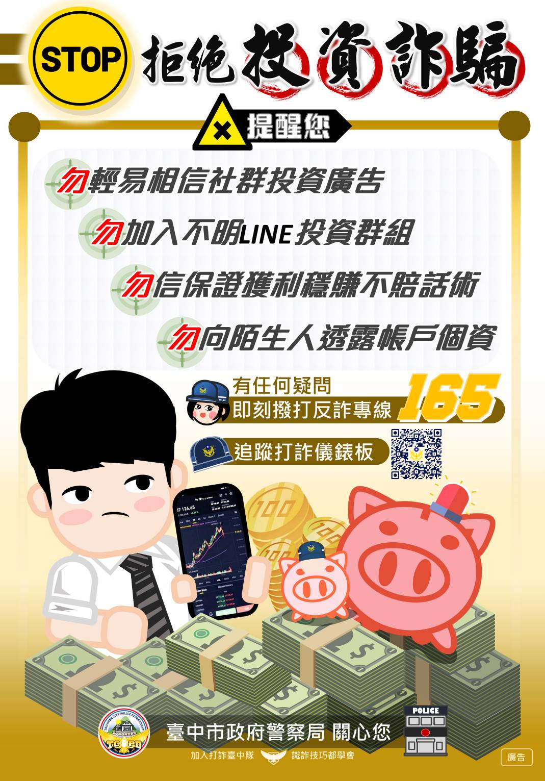 據內政部警政署「打詐儀錶板」數據,統計今年1、2月份,臺中市詐騙案件計發生3,400件,財損計22億5,550餘萬元,其中仍以「假投資」詐騙的財損金額最高,另假網拍及假檢警亦是高發詐騙手法,因此,市警局印製3萬5,000張這3款海報,張貼處所小到各商家、雜貨店,大到鐵(公)路車站、大賣場等日常生活最常觸及的場域等,就是要宣導到位,不要遺漏任何一位民眾。