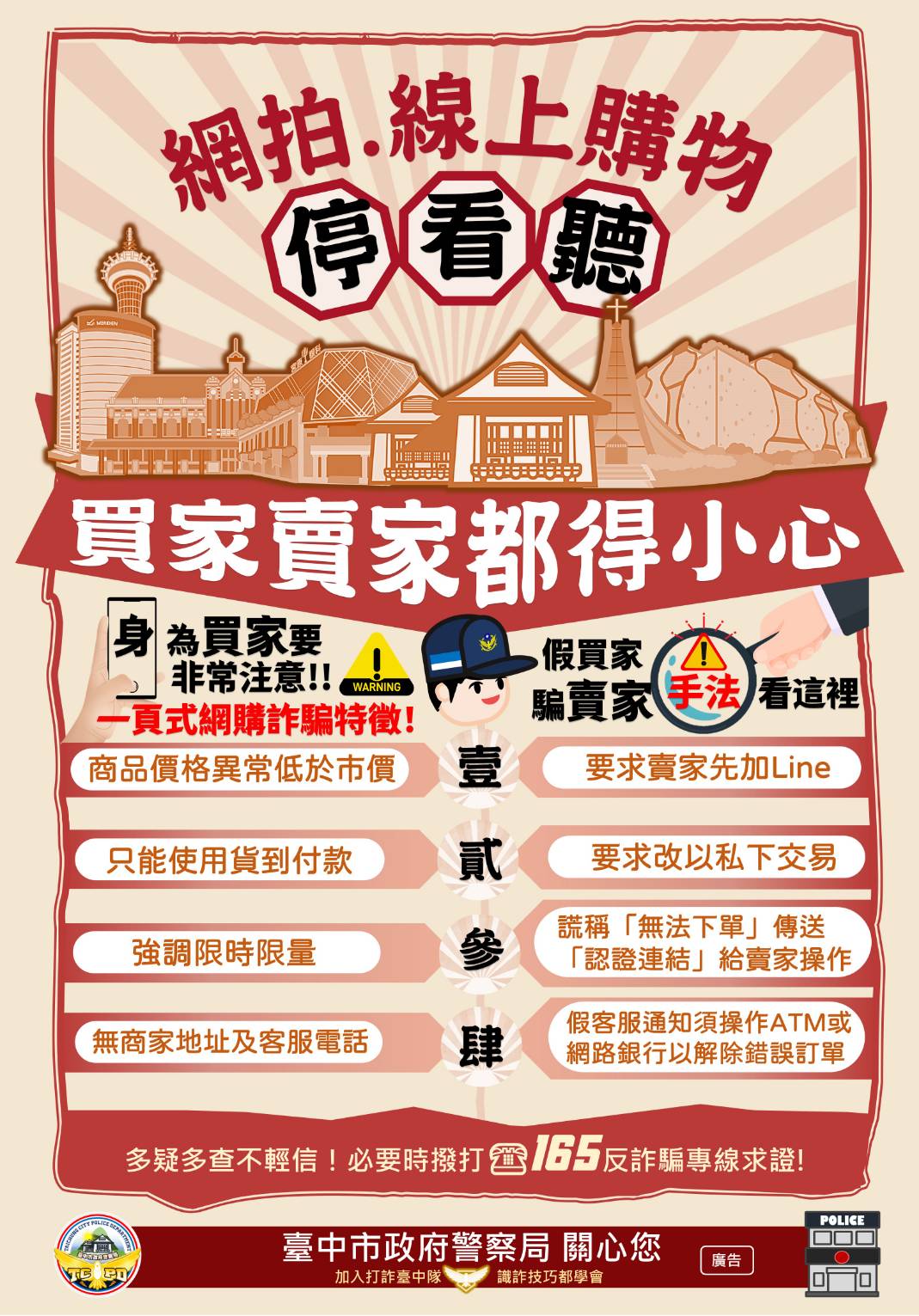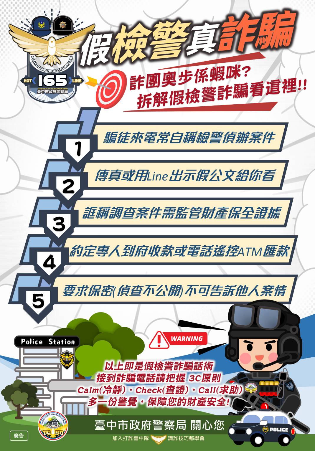 臺中市政府警察局為宣導識詐,讓市民認識詐騙手法,持續不間斷運用各種網路社群媒體、電視、電臺、電視(牆)看板等方式擴大宣導,惟仍有許多民眾未能看見警察宣導的訊息,為讓更多民眾看見並記在心裡去,由警察局同仁自行繪製3款實體海報,將詐騙手法以簡潔易懂的方式呈現,令人印象深刻,揭露臺中市當前高發的前三大詐騙手法,廣布於學校、長照中心、車站、KTV、電影院、娛樂場所、百貨公司、大賣場、旅宿業、金融機構、宗教場所、醫院及各種公民營場所等,鋪天蓋地提醒民眾認識詐騙手法,使反詐騙宣導不遺漏,進而減少被害機會。