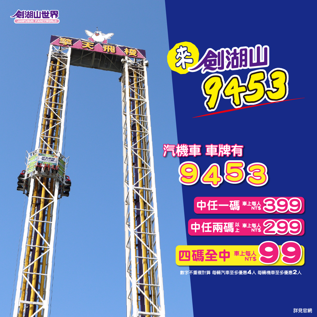 今(8)日劍湖山小編送上跌跌不休的暖心優惠,保證9453 「就是有鬆」,暖心活動從2025年4月9日至2025年6月1日,車牌號碼符合「9、4、5、3」,4碼全中,門票1折(原價999元),只要99元、任中2碼,門票299元、任中1碼門票399元,讓民眾可以輕鬆遊樂園,來劍湖山『就是有鬆』。更多暖心服務詳洽劍湖山官網https://reurl.cc/Q52nbp