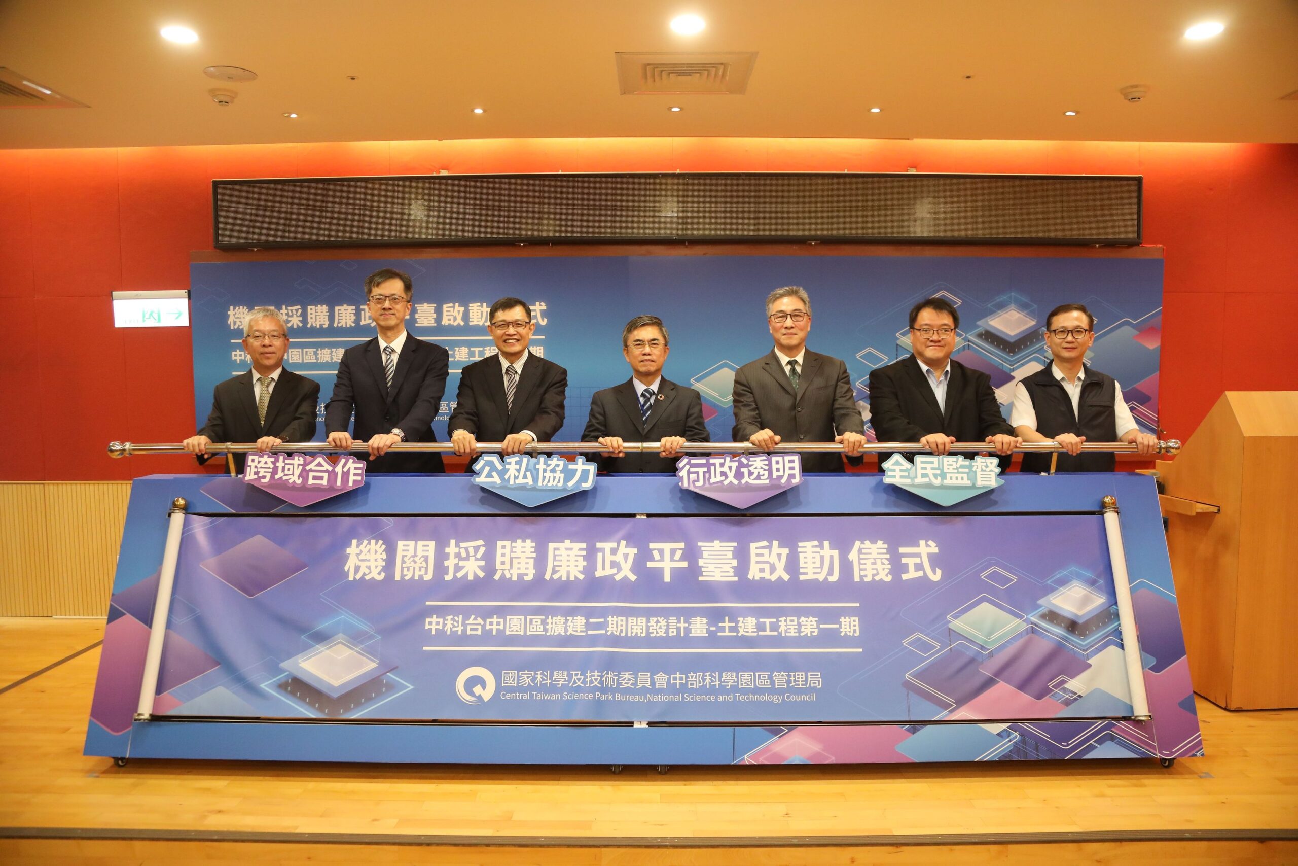 國家科學及技術委員會中部科學園區管理局於今(21)日舉辦「中科台中園區擴建二期開發計畫-土建工程第一期」機關採購廉政平臺啟動儀式,由國科會林德生處長、臺灣臺中地方檢察署張介欽檢察長、法務部廉政署中部地區調查組劉俊杰組長、行政院公共工程委員會徐偉峻專門委員及法務部調查局臺中市調查處臺中站應明中主任、內政部警政署保安警察第二總隊第三大隊陳述豪副大隊長等機關代表,與中科管理局許茂新局長共同宣示啟動,並邀請設計監造與施工廠商到場見證,展現跨域合作與廉潔施政的堅定決心。