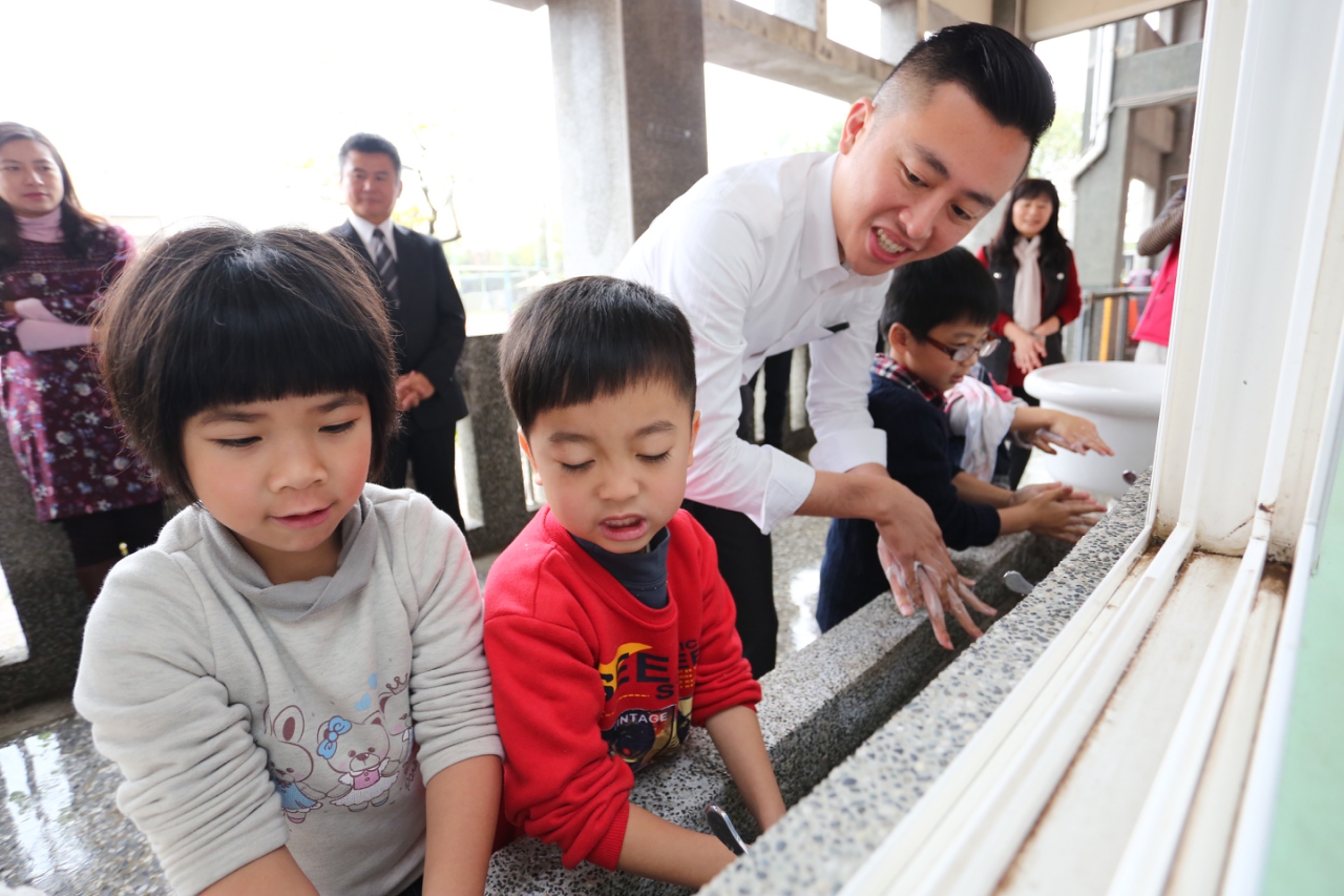 面對天真的孩童,林智堅市長不僅透過「有獎徵答」進行衛教宣導,也專心聆聽孩子們傳授「小撇步」,譬如「搓肥皂」至少需持續=二十秒、生病後應待在家休養,避免二度傳染,最後再由市長與孩童,共同練習正確的洗手步驟。