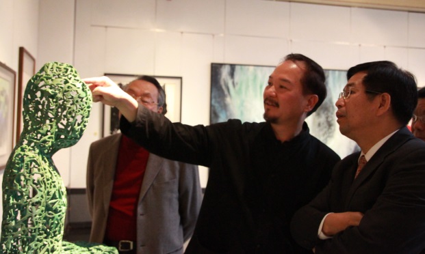 圖說:許文融教授(中)向潘文忠副市長(右)解說展出作品。(記者楊川欽攝)