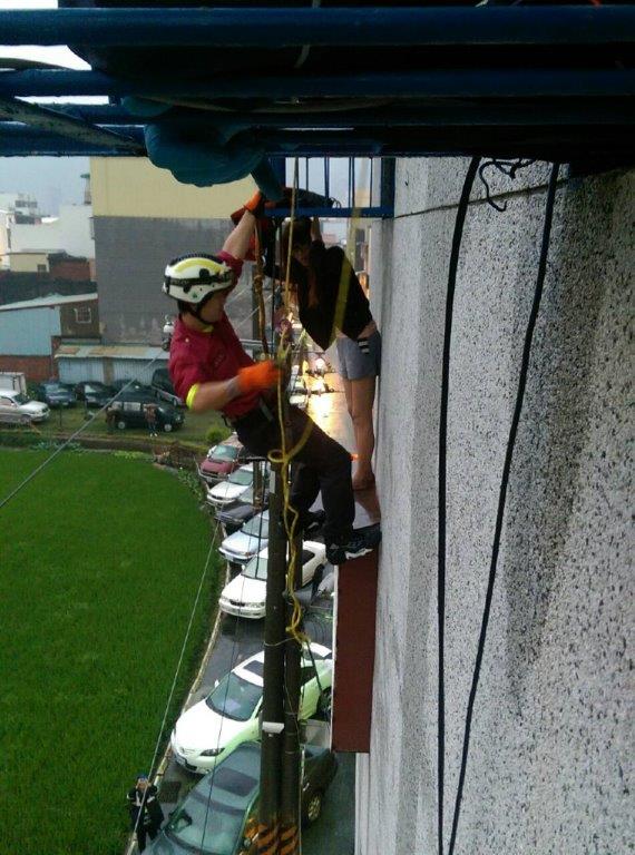 仁武警分局員警據報許X勳涉嫌持有毒品,於二十三日下午前往高雄市仁武區高楠八街許嫌處所執行查緝時,許嫌同居女友陳X芬聽到聲響,自四樓處所開窗向下探望,發現警方正從一樓往上,擔心本身通緝身分遭查獲,情急之下欲自四樓窗台攀爬向下逃逸,不料三樓遮雨棚強度不足,陳女不敢繼續踩踏向下,即卡在三樓與四樓窗台間險象環生,該分局員警見狀立即安撫陳女情緒,並立即通報消防隊仁武分隊前往救援,仁武分隊於到達現場後,本欲以雲梯車將陳女就下,惟現場附近均為農田雲梯車無法進入,最後消防隊改以垂降方式進行救援,始將陳女救下,陳女攀掛在窗台上超過一小時,救援到地面後全身已癱軟無力。