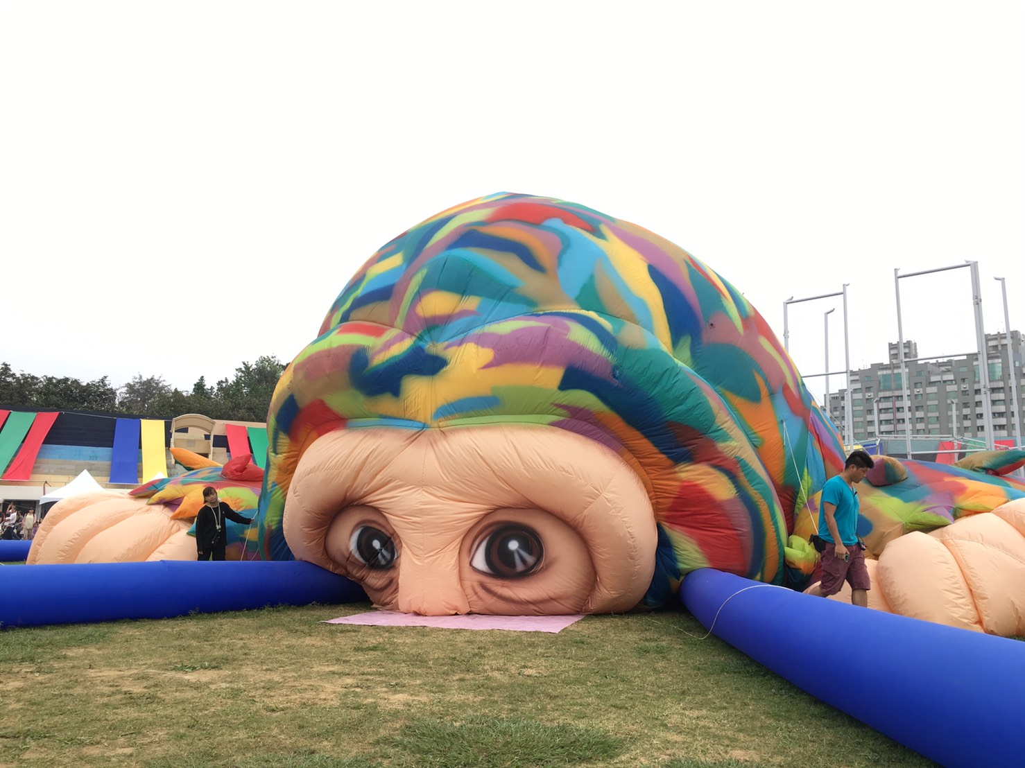 上午吸睛的「紅毛猩猩起床秀」仍吸引大批孩子駐足,在全場奮力加油,要牠「別再賴床」下,五顏六色的大猩猩總算不再「睡眼惺忪」,緩緩露出雙眼與鼻子,精神飽滿地站在草坪上,揪孩子趁最後一天玩個過癮。