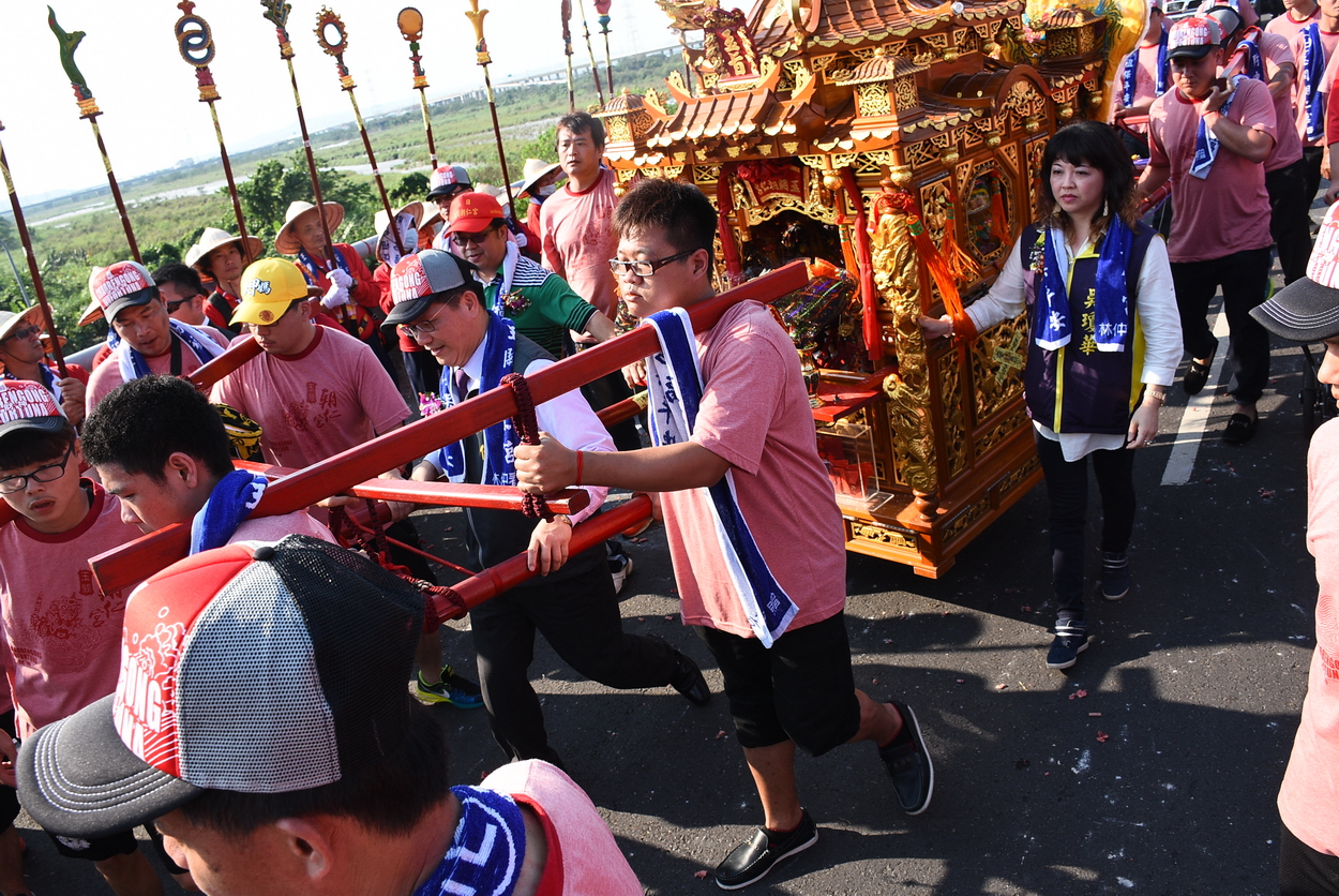 上香結束後,林縣長扶財神爺神轎與媽祖鑾轎相互行禮,並往敦和宮出發,信徒跪拜於轎前「鑽神轎」祈求平安,沿途信眾猶如長龍,相當壯觀。