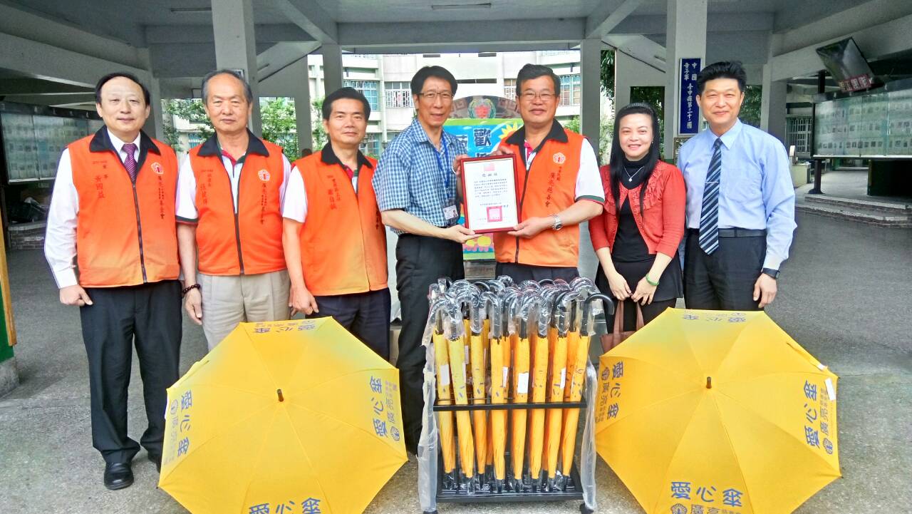 圖說:廣亮慈善基金會捐贈雨傘及傘架給學校。(記者陳祐強翻拍)