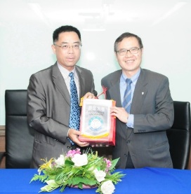 圖說:副校長周文光(右)與越南台灣商會聯合總會總會長謝明輝展示產學合作備忘錄。(記者楊川欽攝)
