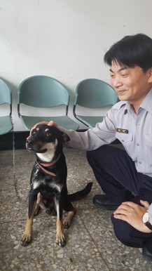 有一好心民眾拾獲一隻土狗,送交至清水派出所,所長張勝記於會議結束後,見其色澤烏黑亮麗相當溫馴,靜靜的坐在派出所值班台旁,模樣相當討喜,主動前往與這隻土狗互動,結果牠竟然一點也不怕生,也主動讓所長摸摸頭,實在惹人憐愛。