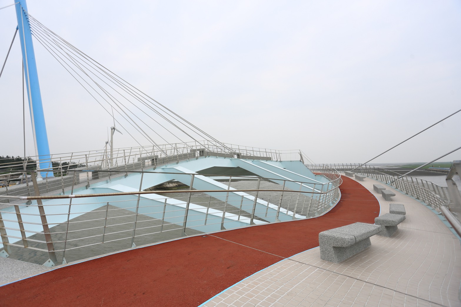 清水區高美濕地景觀橋長度約二百公尺,結構是雙橋塔弧型曲線的鋼橋,工程總經費約二億三千多萬元,歷經二十二個月興建,完工後已進入驗收階段。