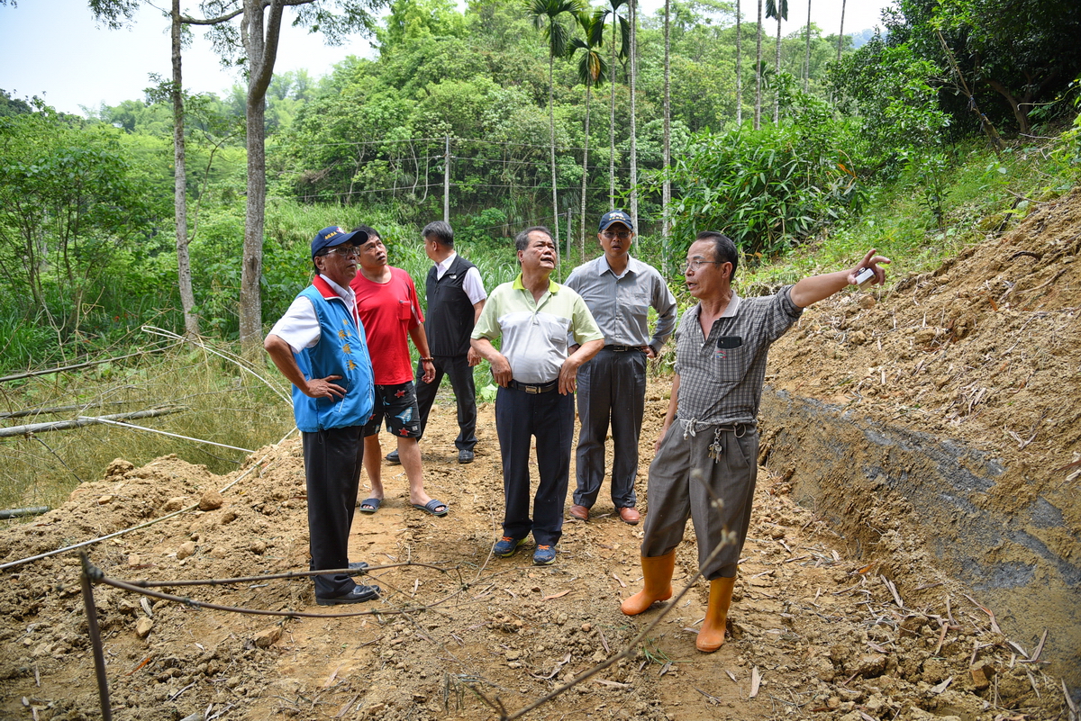 在復興村長官玉瑛、鄉民代表邱寶林陪同下,林縣長及廖議員前往復興村會勘。其中,復興巷旁野溪護岸底部掏空,縣府將規劃一百公尺補強工程;復興村383-3地號後方坡地則將於原擋土牆上設置L型排水溝銜接並匯集上方水流以利排入野溪,避免沖刷山坡。