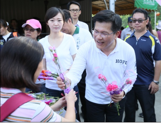 台中市長林佳龍於七日上午前往大坑,經九號步道抵達觀音亭,沿途熱情登山民眾紛紛與他問好合影,林市長抵達觀音亭後,向觀音菩薩祈求國泰民安,並發送三千束康乃馨給登山民眾,祝福母親節快樂。