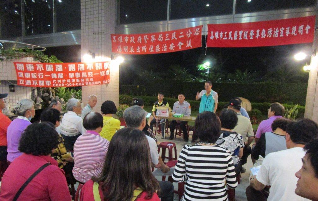 三民警二分局陽明派出所積極營造警民關係,重視民意,深入社區實際了解居民對社區治安與交通的需求,落實社區警政拚治安理念,於本安里守望相助隊隊部舉辦社區治安座談會,邀集里長林幸福及本安里巡守隊成員及近社區居民參加,現場座無虛席,民眾反應熱烈,盼藉由深入社區與居民面對面溝通方式,傾聽民眾心聲並宣導當前警政服務措施。