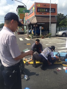仁武警分局鳥松分駐所警員黃文宏、役男許立瑋等二員,於執行巡邏勤務時,獲報在鳥松區中正、忠誠路口,發生車禍有人受傷,請警方到場處理。