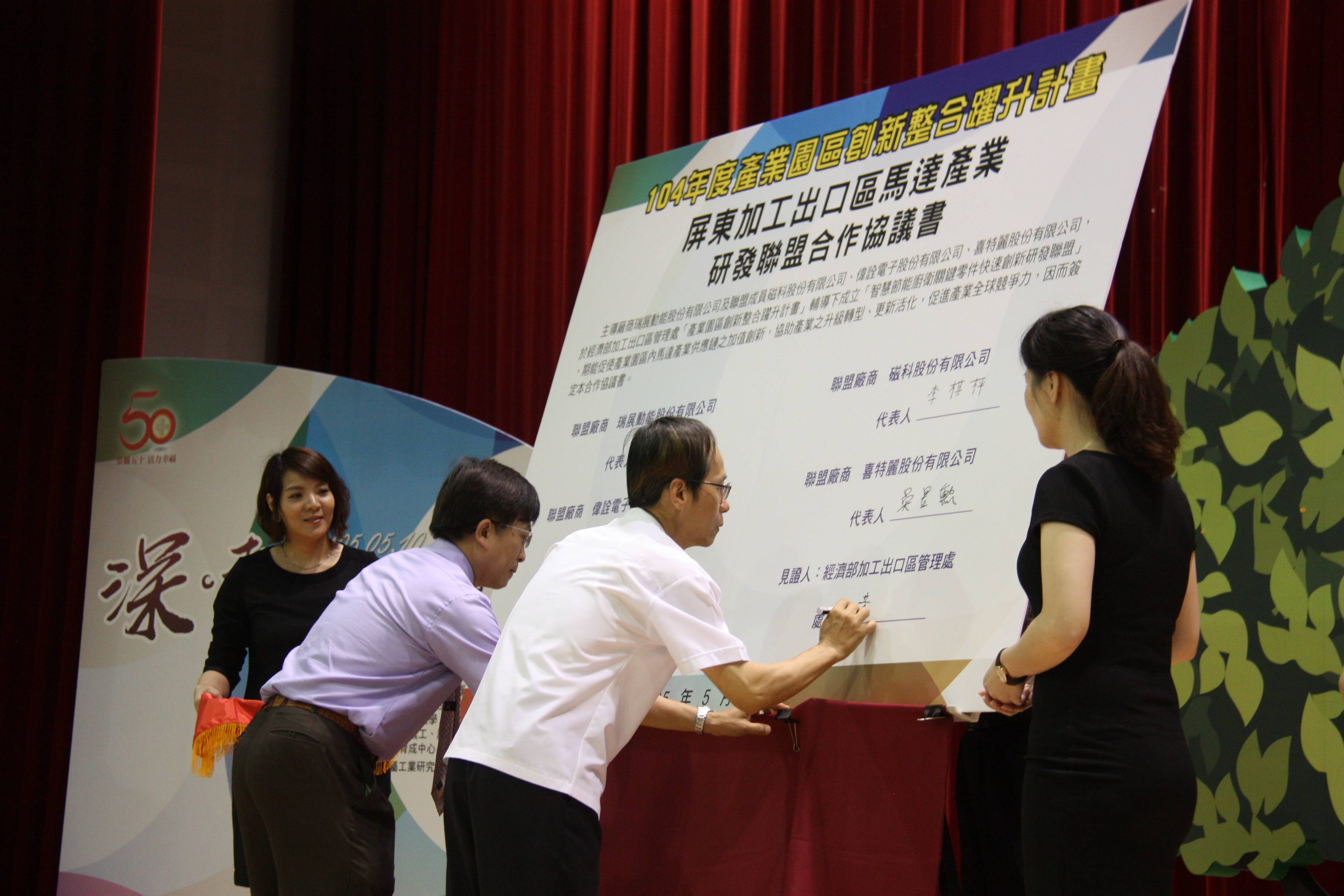 黃處長指出,去年加工處輔導廠商申請政府補助,促進廠商投入創新研發達二點六億元,此外,自一00年開始更與中鋼集團、金屬中心、成大馬達科技中心等攜手合作,於屏東加工區打造南臺灣馬達產業聚落,結合各部會資源,協助廠商研發提升節能效率、培育馬達專業人才,並成立淨水設備聯盟(W-Team),今年在金屬中心協助之下,更跨域結合區外廠商推動成立「智慧節能廚衛關鍵零件快速創新研發聯盟」,非常榮幸與大家共同見證聯盟成立這歷史性一刻。