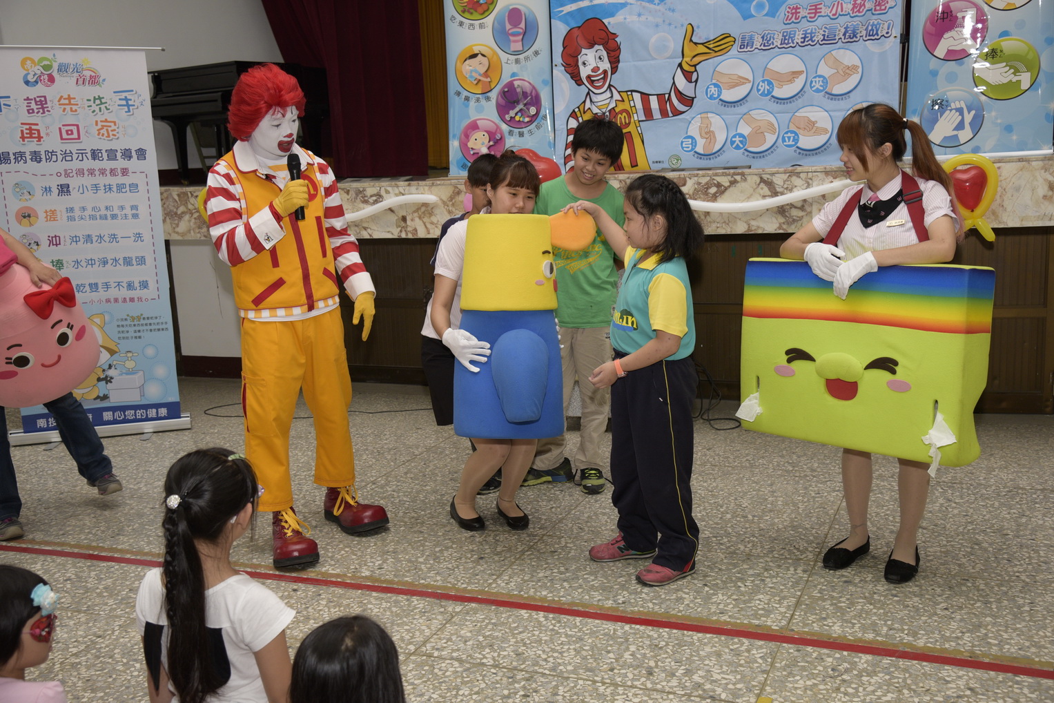 活動中,在麥當勞叔叔幽默風趣的帶動下,與小朋友們互動相當熱絡,尤其麥當勞叔叔問學生如何洗手,小朋友馬上大喊出「濕、搓、沖、捧、擦」,陳副縣長肯定宣導成果;麥當勞叔叔也透過玩遊戲的方式,邀請小朋友參與表演,並灌輸正確洗手步驟與方式,期學生都能成為小班長,在校督促同學勤洗手,回家教家人如何洗手,免除腸病毒威脅。
