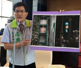 圖說:議員楊典忠展示外縣市的標誌質詢。(記者楊川欽攝)