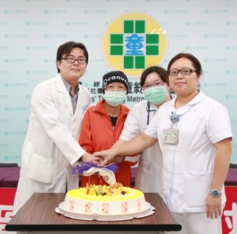 圖說:患者與醫師、護士一起切蛋糕慶祝重生。(記者楊川欽攝)