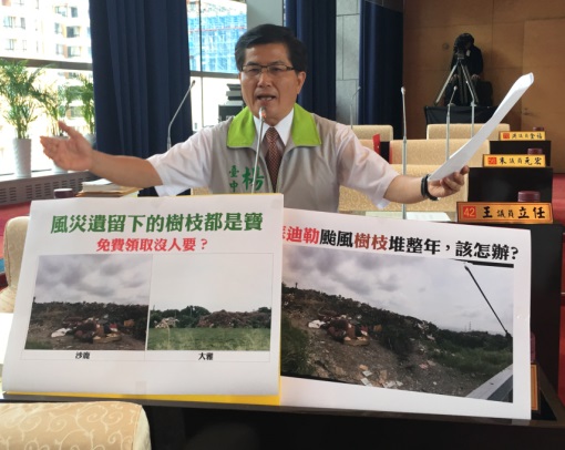 「樹枝(葉)再利用及木料領用計畫」是台中市政府的創舉,去年講得很好聽,風災遺留下的樹枝都是寶,結果免費領取卻沒人要?議員楊典忠批執行不力。