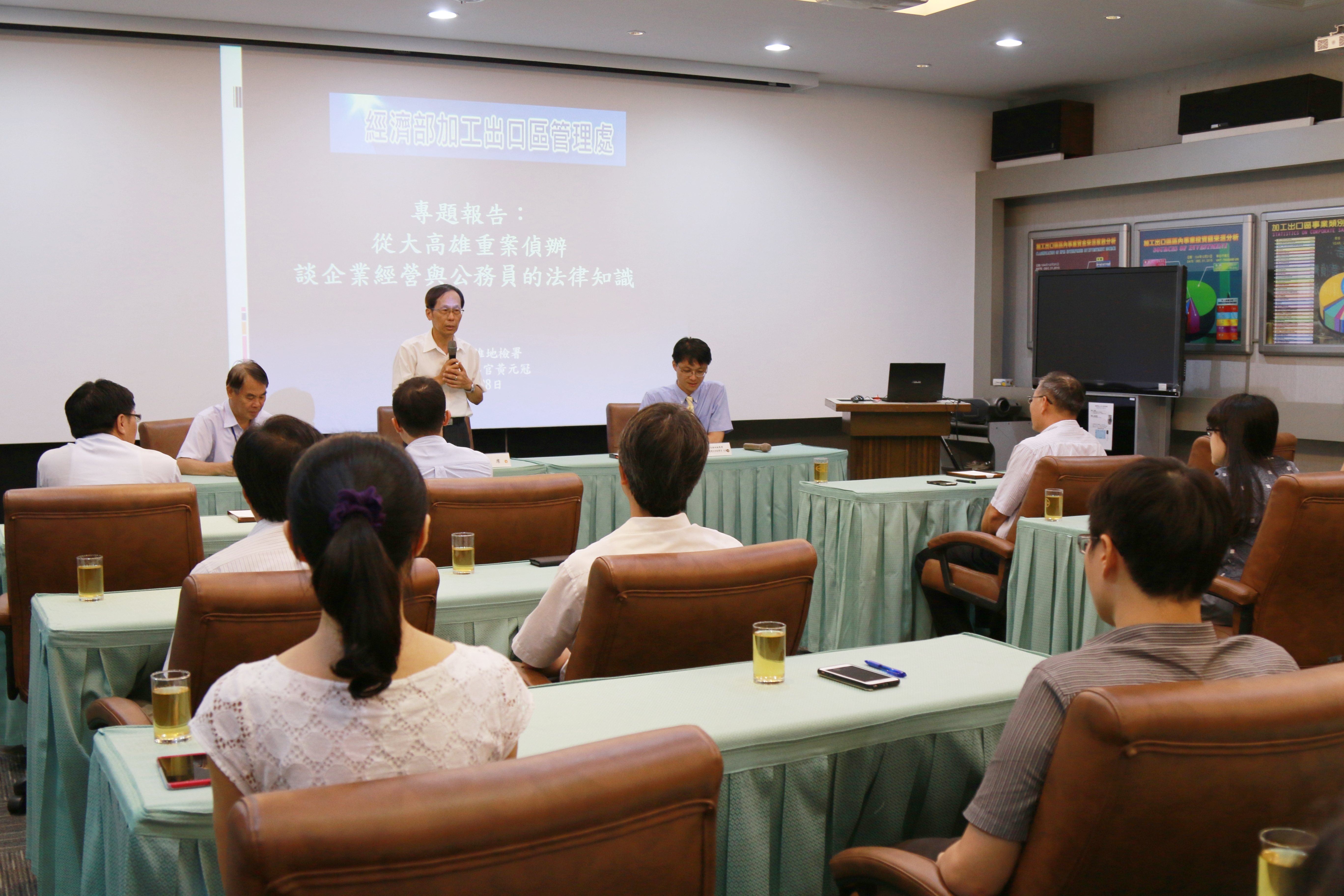 經濟部加工出口區管理處(加工處)於召開廉政倫理專案講習巡迴座談會,由黃文谷處長親自主持,邀請高雄地檢署襄閱主任檢察官黃元冠擔任講座,以案例結合法令方式強化同仁對於廉政法令認知,期能提升行政廉潔效率,營造優質廉能的公務環境。